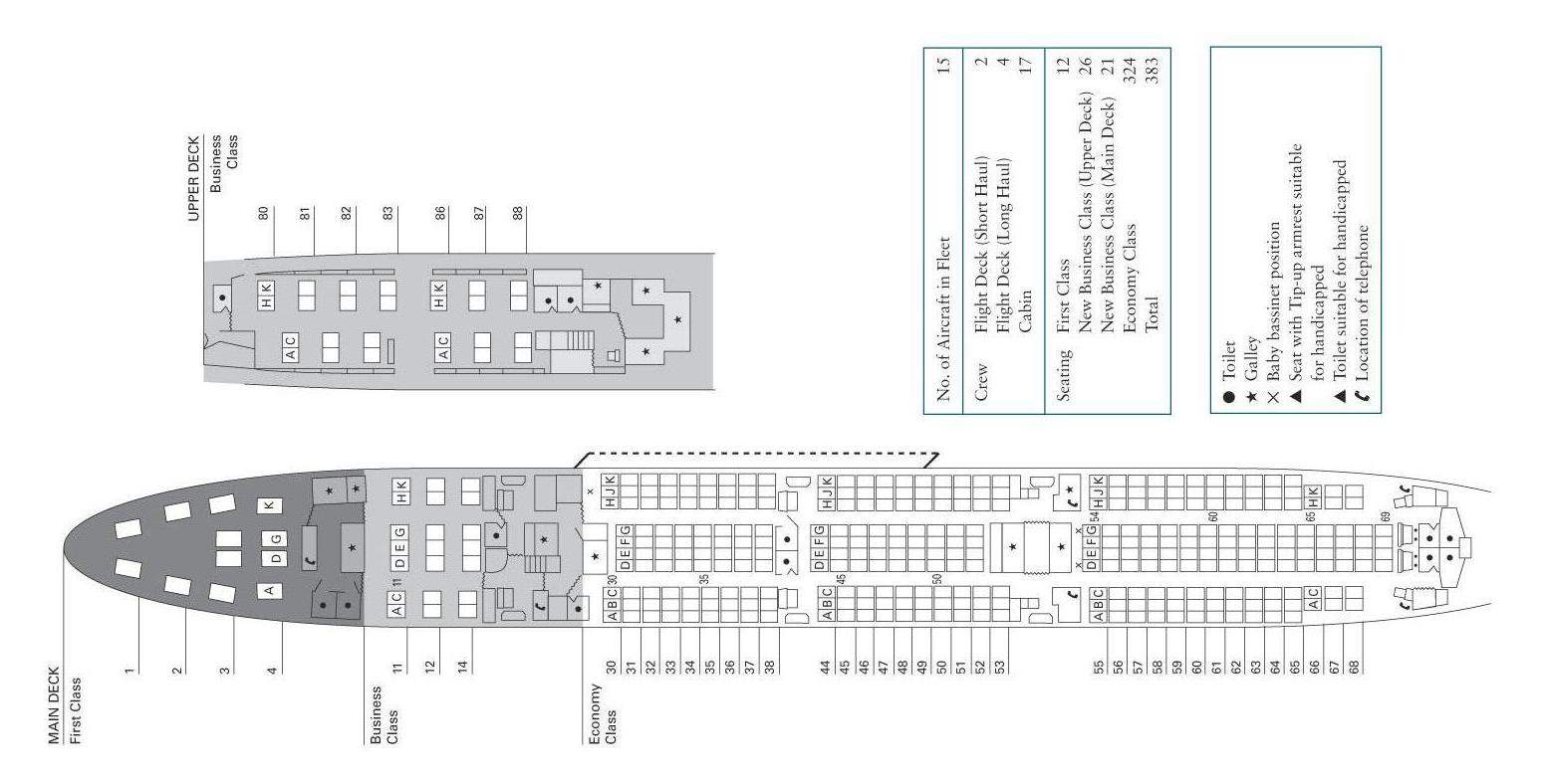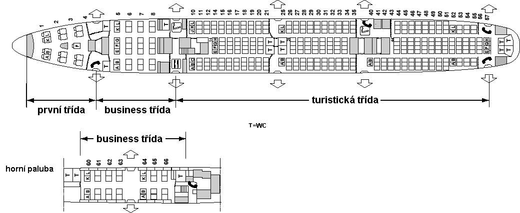 Jestliže 747 disponuje nejvyšší, tzn. první třídou, nachází se téměř bez výjimky v prvním patře letadla, hned za pilotní kabinou. V tomto případě se vždy jedná o vlastní luxusní kóje, které lze samozřejmě použít jako pohodlná lůžka ke spaní. Samozřejmostí je nepřetržitý servis, a to v průběhu celého letu.